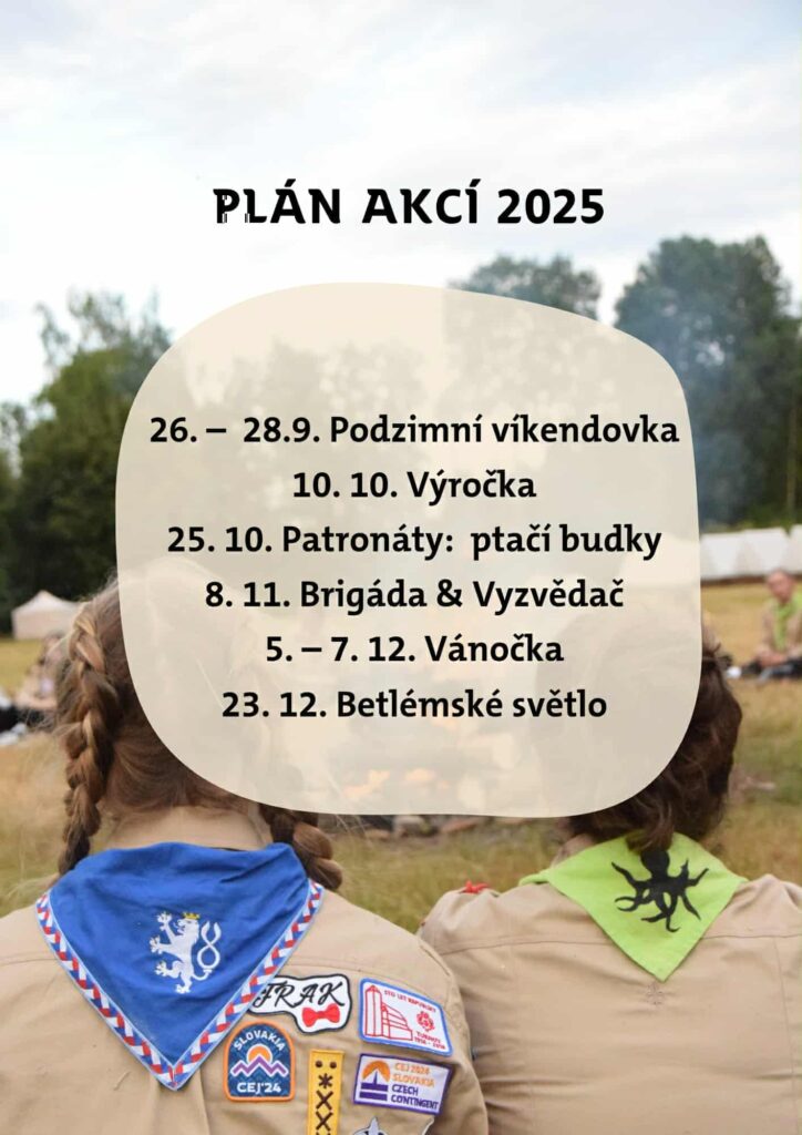 - s sebou: 550 Kč, na sebe skautské tričko a šátek, spacák, karimatka (stačí nenafukovací, v klubovně jsou matrace), oblečení dle počasí, pláštěnka, přezůvky, hygiena, šátek na hry, zápisník a tužku, jídlo a pití na pátek, buchta na snídani